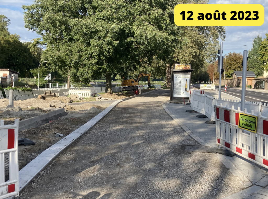 Depuis quelques semaines, la circulation a été partiellement rétablie pour l’accès à la gare routière. Nous soulignons la mise en place d’un marquage bidirectionnel avec la mise en place de poteaux jaunes afin de garantir une continuité de l’itinéraire. La présence de feux clignotants peu respectés par les automobilistes et l’absence de sécurisation du virage à l’intersection avec l’avenue du Rhin rendent néanmoins la circulation fastidieuse.